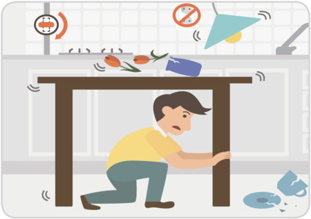 지진은 크게 흔들리는 시간은 길어야 1~2분 정도입니다. 튼튼한 탁자의 아래로 들어가 탁자 다리를 꼭 잡고 몸을 보호합니다.