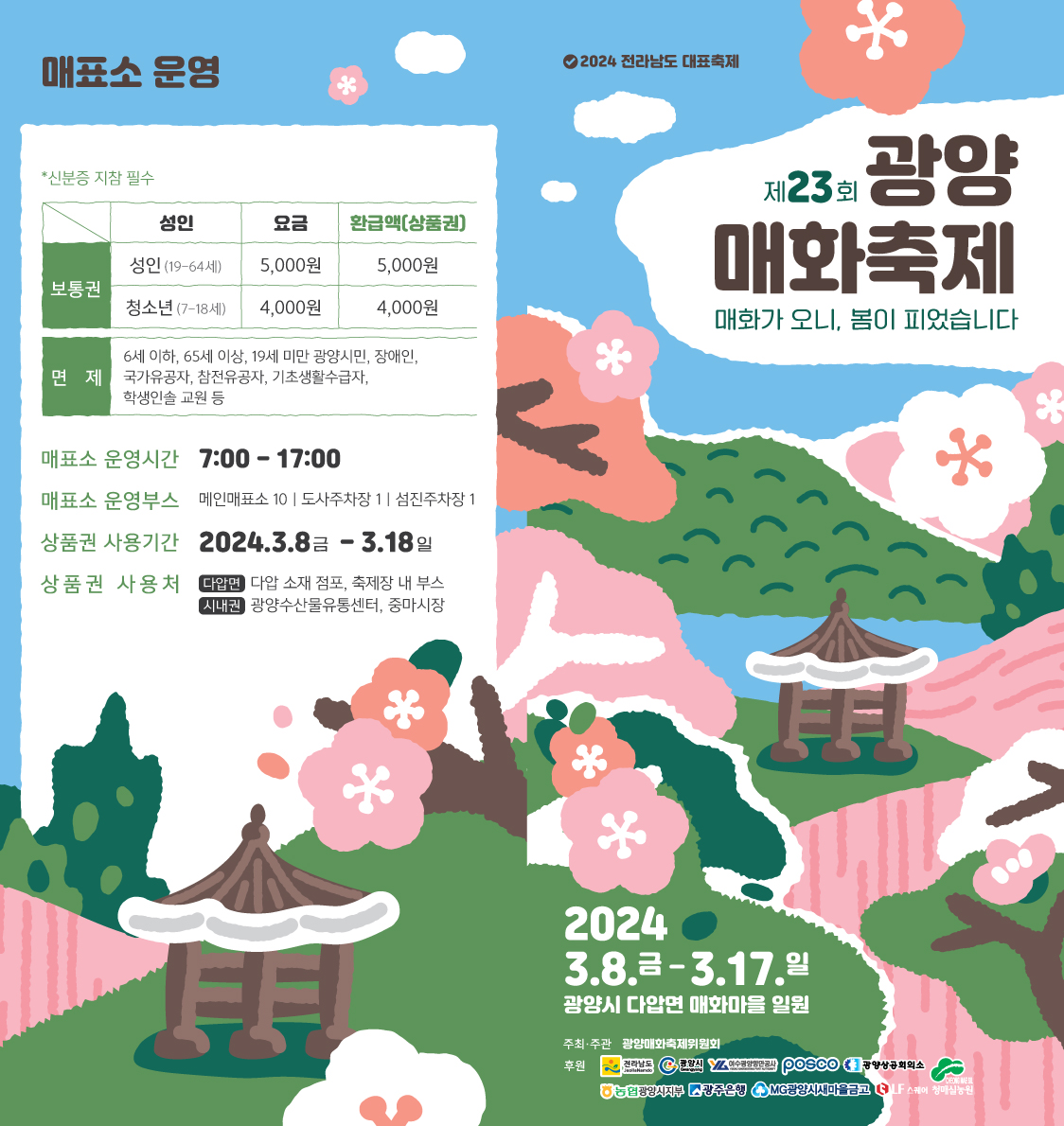 2024년 봄 축제 일정에 광양 매화축제가 있습니다! 개화 소식을 알린 제23회 광양 매화축제는 1박 2일 프로그램을 비롯해 여러 가지 다양한 프로그램도 즐길 수 있다고 합니다. 꽃도 보고 여러 가지 프로그램도 즐길 수 있으니 일석이조의 축제가 아닐까 싶습니다.