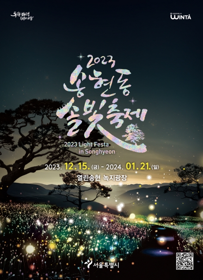 '2023 송현동 솔빛축제'는 '신비로운 빛의 정원을 거닐며 초자연을 만나다'를 주제로 빛의 언덕, 빛의 산책, 그림자 숲, 빛의 소리, 중앙가든, 빛의 길 등 여섯 가지 전시공간으로 구성됩니다. 호빵과 붕어빵 등 간단한 간식을 맛볼 수 있는 부스, 기념품 판매점 등을 운영한다고 합니다.